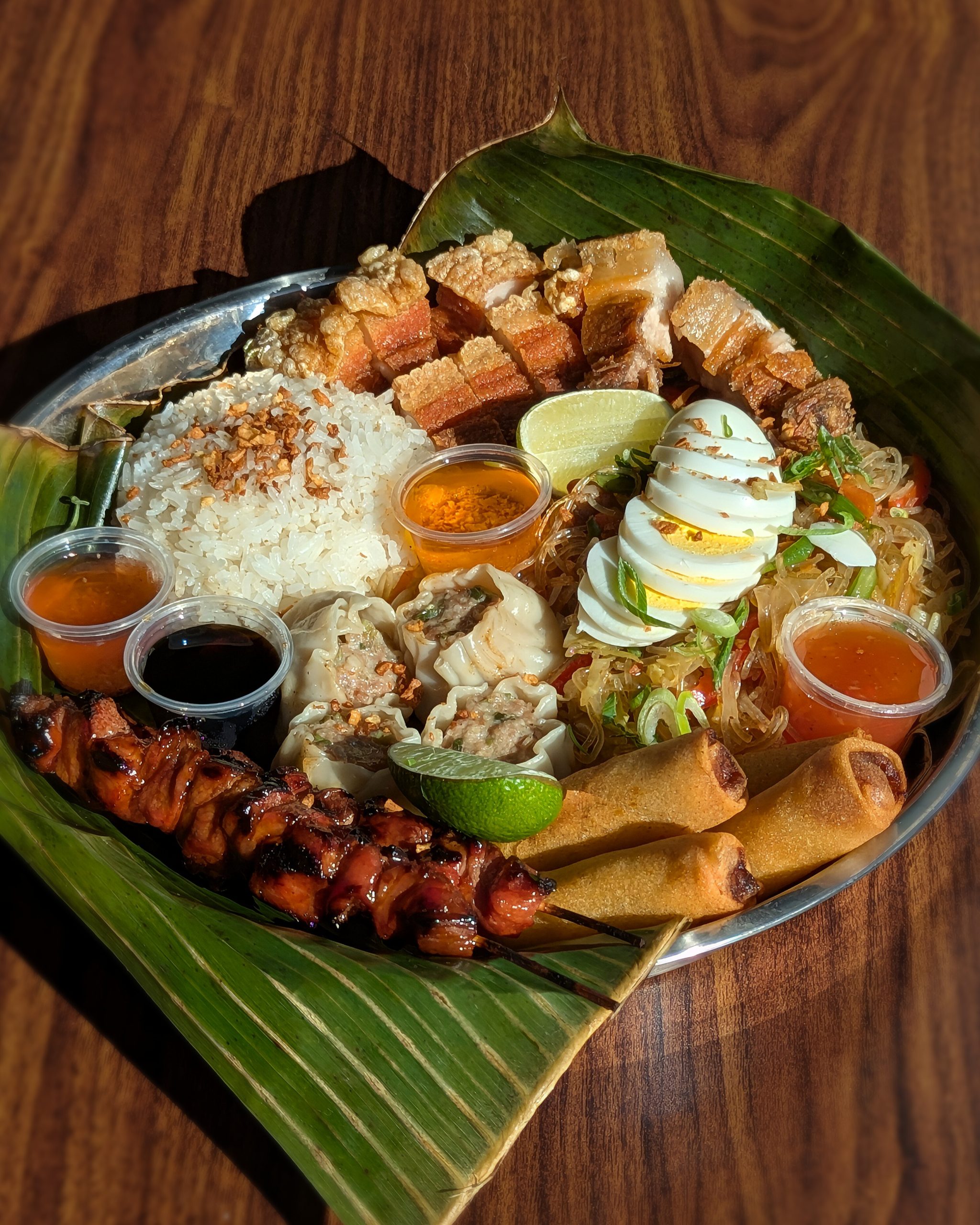 A feast for two featuring our house BBQ skewers, juicy siomai, crispy pork spring rolls, classic pancit noodles, golden lechon kawali, and fragrant garlic fried rice. Perfect for sharing and sampling the best of our kitchen favorites.